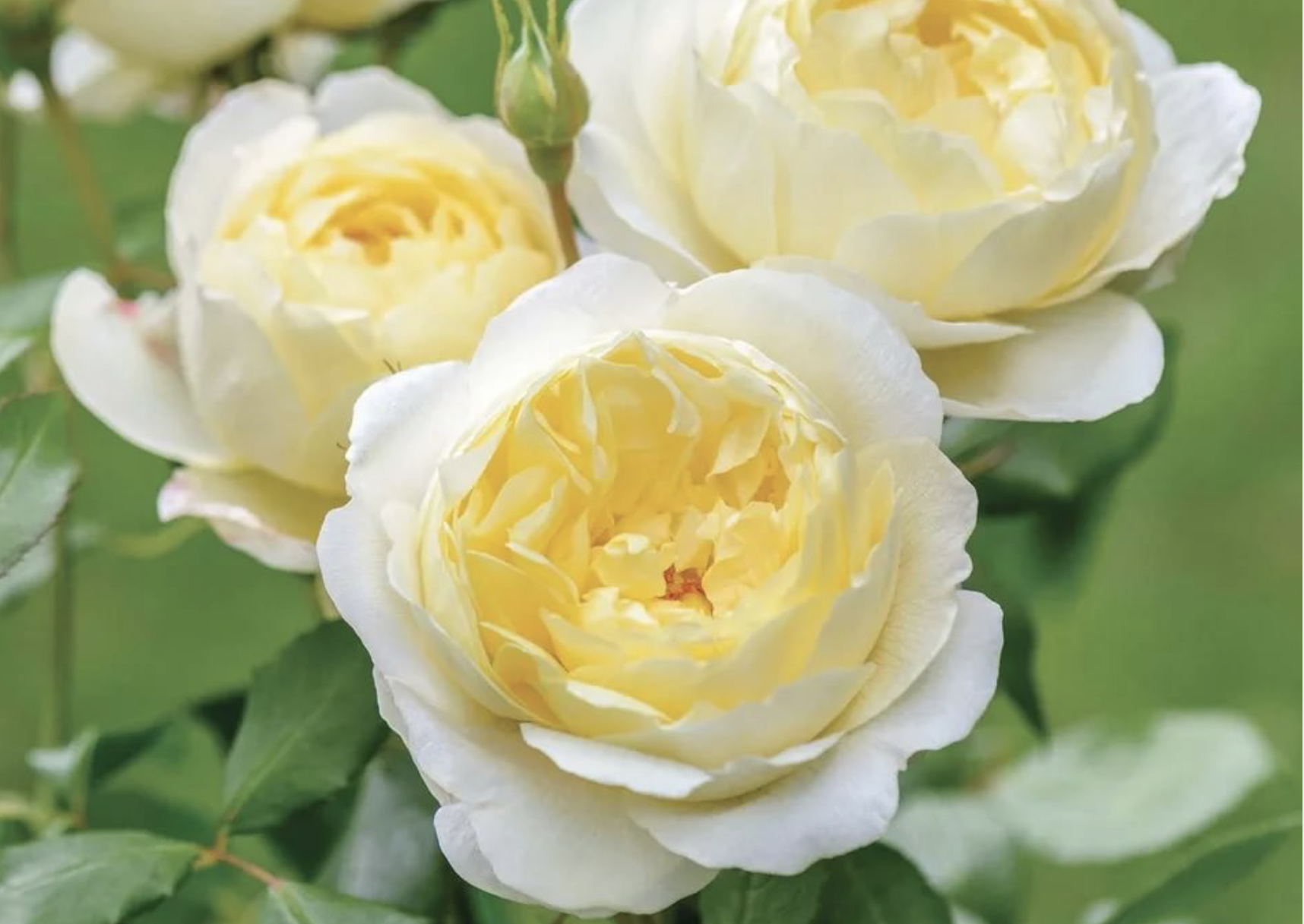 Округлые бутоны окрашены в нежные, пастельные тона лимонно-желтых и кремово-белых оттенков, иногда с заметной розовой палитрой. Издалека стебель кажется покрытым шариками сливочного пломбира. Шаровидные или чашевидные, среднего (6–7 см) размера в диаметре, цветки обладают бледно-желтой окраской с добавлением кремовых и молочных тонов без пестроты. Густомахровые бутоны состоят из 40–60 шелковистых матовых лепестков с закругленными краями, в центре расположен венчик золотисто-желтых тычинок.
